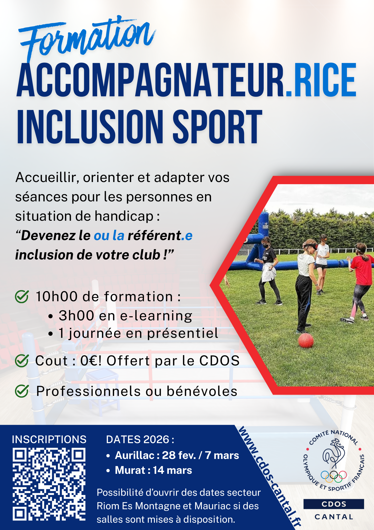 La Commission Inclusion et Sport pour Tous du Comité Olympique et Sportif Départemental du Cantal (CDOS 15) a le plaisir de vous inviter à participer à la formation « Référent Inclusion Sport ».