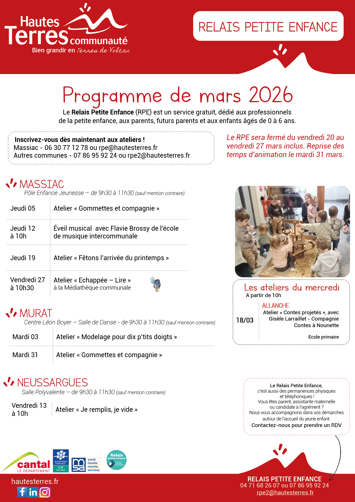 Les programmes mensuels de Hautes Terres Communauté sont actualisés chaque mois. N’hésitez pas à consulter régulièrement cette page pour découvrir les nouveautés et vous tenir informé des activités proposées à Murat, Neussargues, Massiac et Allanche.